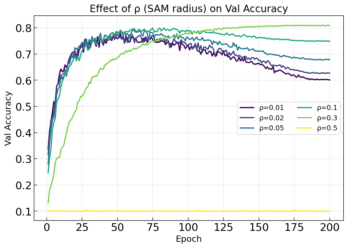 ax.set_title('Effect of ρ (SAM radius) on Val Accuracy')