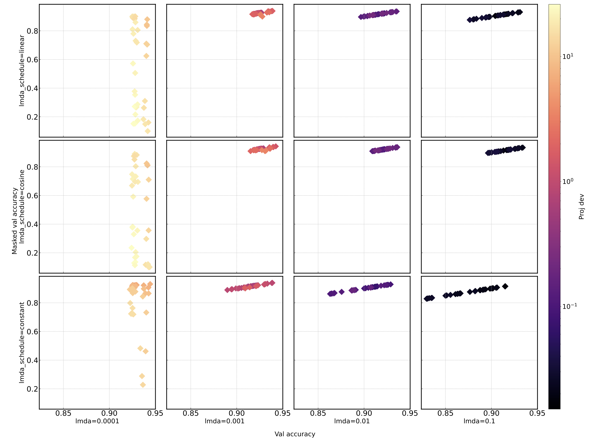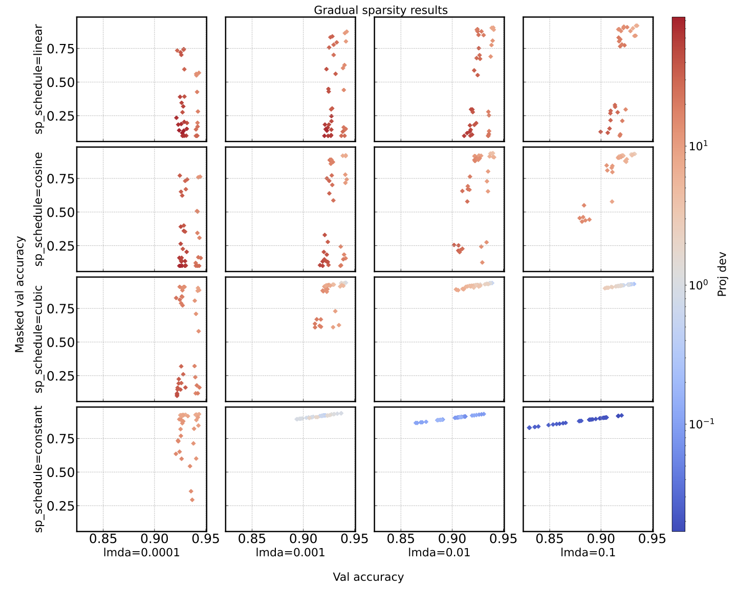 4x4 grid by lambda (columns) x sparsity schedule (rows), colored by proj dev